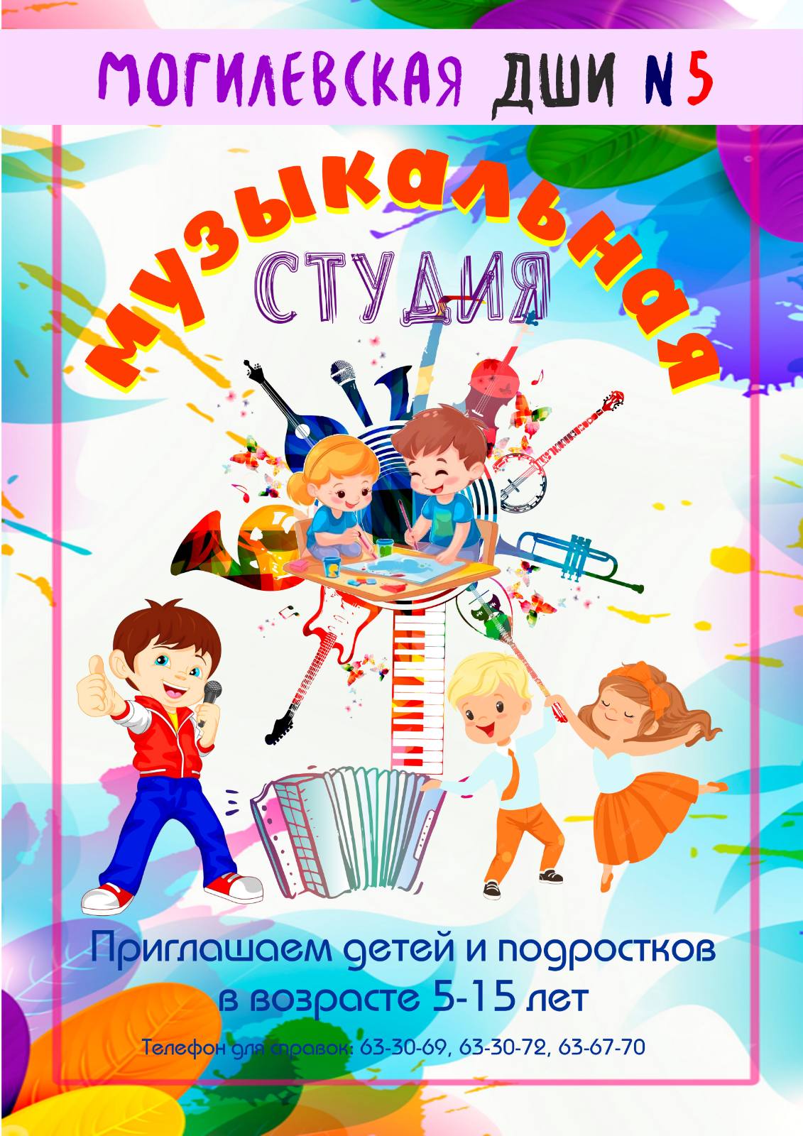 Могилевская ДШИ N5 приглашает детей и подростков в возрасте от 5 до 15 лет в музыкальную студию для занятий по вокалу, рисованию, хореографии, обучению игре на музыкальных инструментах.
